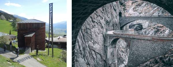 Gelbes Haus Flims, Türalihus Valendas, Cinema Sil Plaz Ilanz, Caplutta Sogn Benedetg, Kloster Disentis, Andermatt, Teufelsbrücke, Schöllenenschlucht, Lawinenunterstände Vorderried, NEAT-Bauwerke Erstfeld