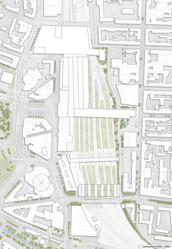 Die Brücke wird unabhängig von den Gleisführungen als klarer Stadtraum positioniert. Ihre Brückenköpfe verknüpfen das Wegnetz präzise mit Markthallenplatz, Gundeldinger Quartier und dem neuen Bahnhofszugang. Ein identitätsstiftendes Dach begleitet diese Verbindung und macht die neue Bahnhofwestseite zu einem eigenständigen Ort mit starker städtebaulicher Ausstrahlung.