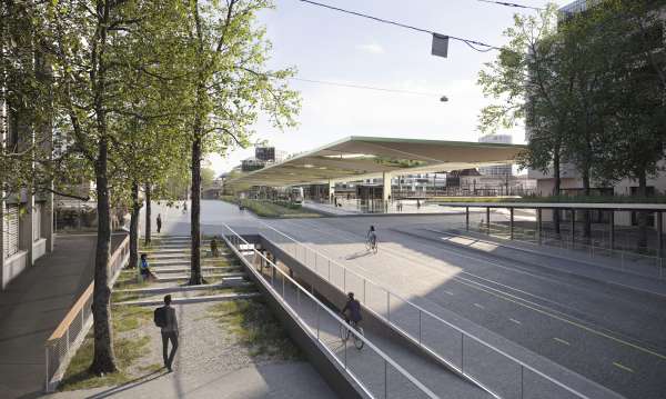Das Dach lagert auf drei Stützen, die so platziert sind, dass bei späteren Ausbauschritten nichts mehr angepasst werden muss. Es entsteht ein dynamischer, übersichtlicher und kundenfreundlicher Raum unter dem Dach, der von Regen und Sonne geschützt ist. Die bei den Querträgern abwechselnd springende Dachhöhe bringt eine Rhythmisierung in die Grossform, die den Massstab bricht und seitliches Licht unter das Dach bringt.