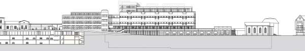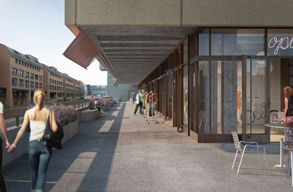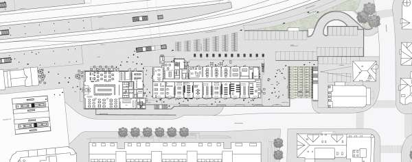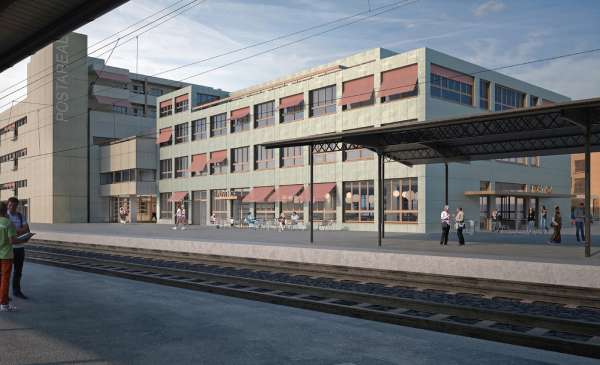 Ein neuer Durchgang auf Platzniveau trennt die beiden bestehenden Gebäude und schafft eine Verbindung vom Perron 1 zur Arkade. Die dort angesiedelten Shops beleben den gedeckten Vorbereich, der in eine Stadtterrasse mit Aussicht Richtung Kurpark mündet.