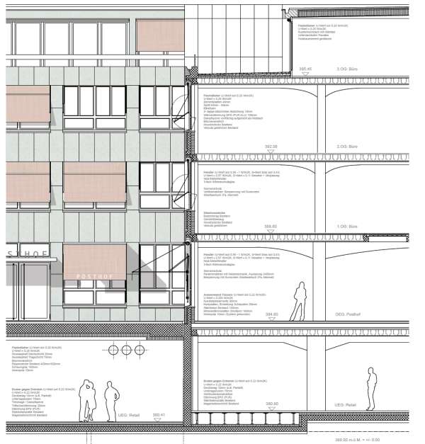 Im darunterliegenden Geschoss wird die Hauptverkaufsfläche der neu positionierten Post (als Teil des Metroshoppings) durch eine Querverbindung getrennt. Diese erschliesst die beiden Treppenhäuser und führt in der Verlängerung in die neue Quartierverbindung mit Perronaufgängen, die von der Stadt Baden realisiert wird.